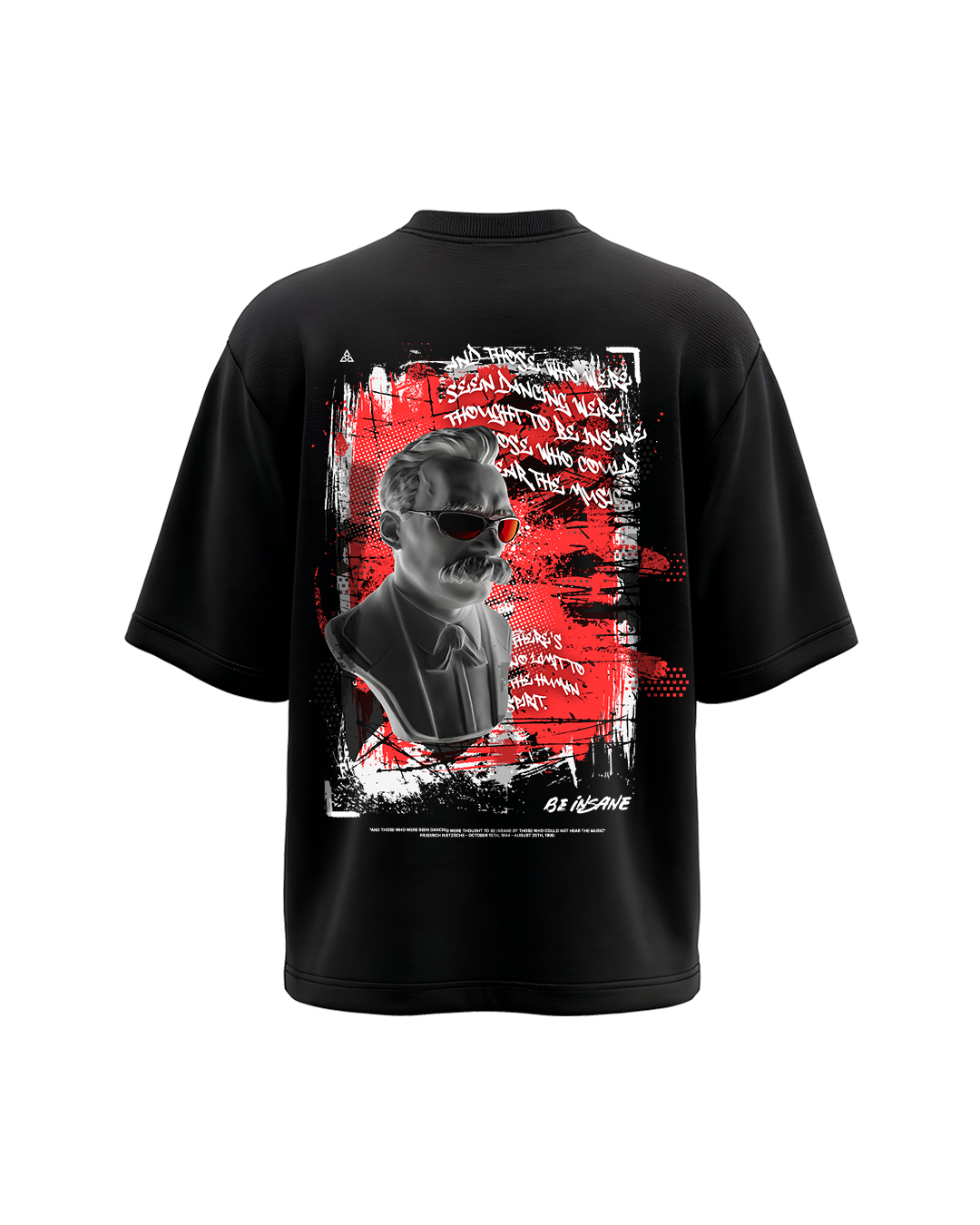 Na parte de trás, a peça estampa uma frase icônica baseada na obra de Friedrich Nietzsche: