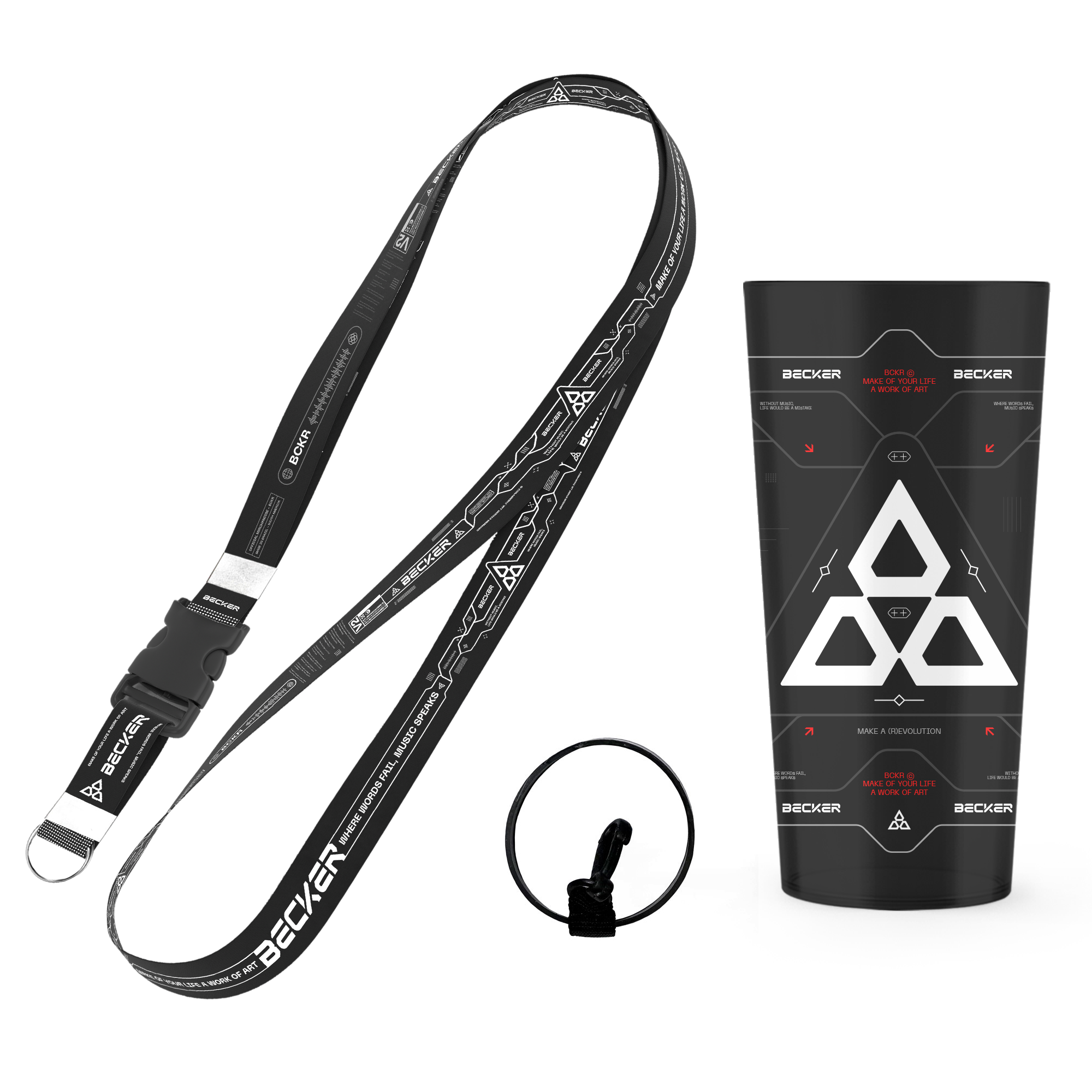 Desenhado com base em códigos visuais, o kit copo "Make a (R)evolution" carrega o DNA estético do Becker em cada detalhe, um acessório cheio de estilo, moderno e funcional, feito para quem acompanha cada passo do artista.