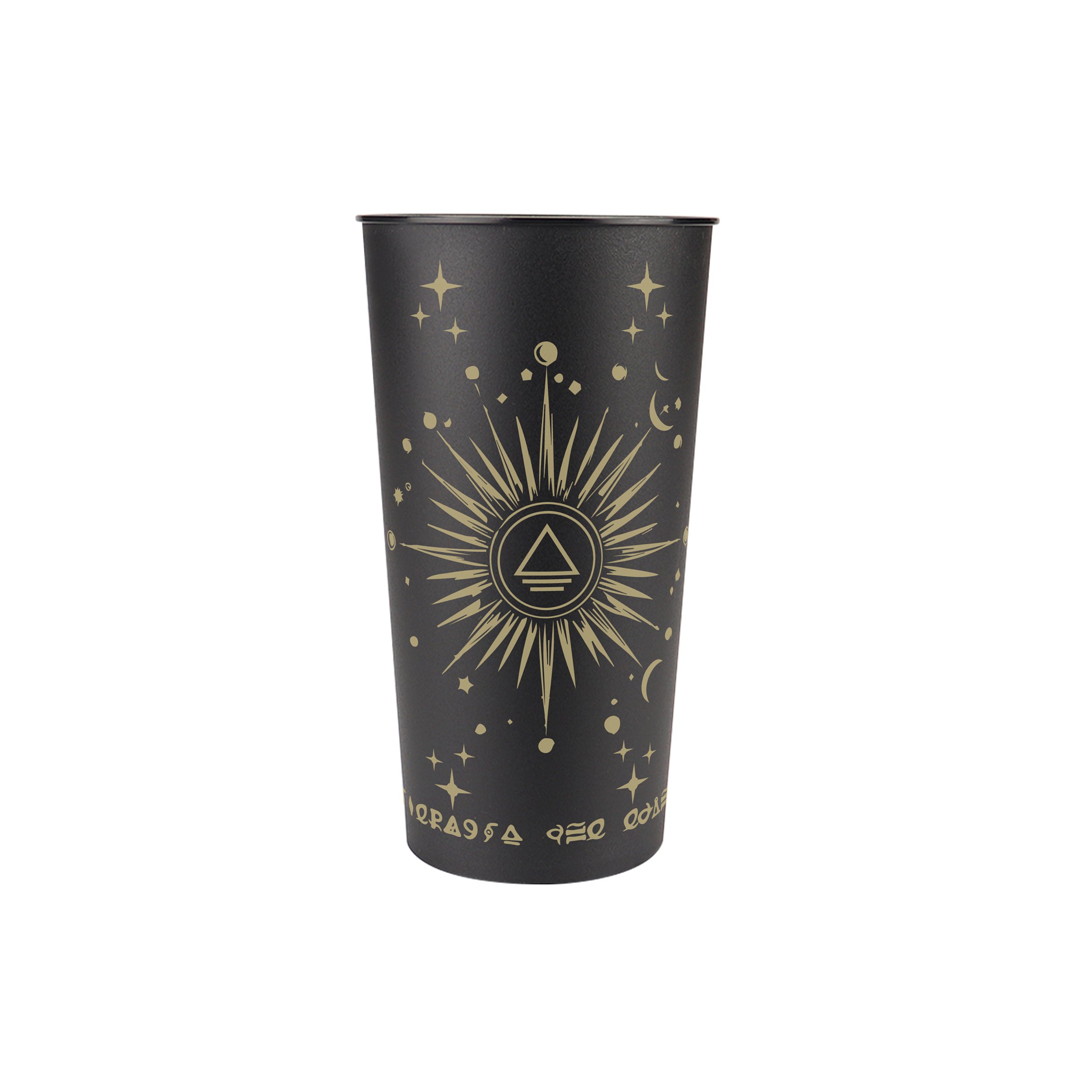 A arte do copo traz elementos místicos representados na identidade visual do álbum The Chase, enquanto o tirante personalizado exibe o alfabeto simbólico desenvolvido especialmente para o álbum, carregando significado em cada detalhe.